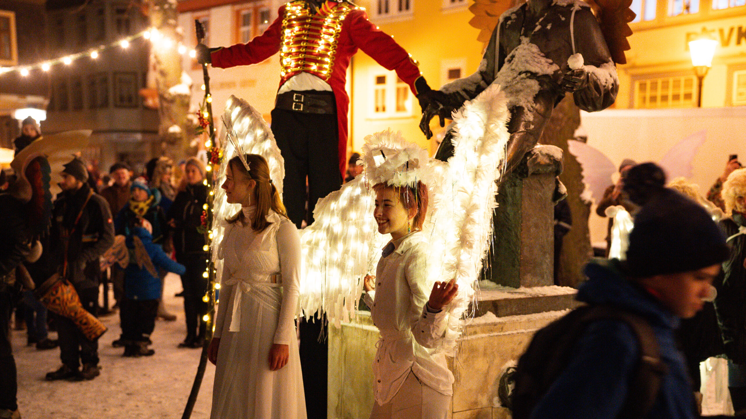 Zum diesjährigen Thema „Klang“ einen Umzug zu veranstalten ist nicht schwer. Kinder, die sich hörbar machen wollen, gibt es überall, ganz sicher in allen Arnstädter Schulen. Sie werden sich ausrüsten, mit allem das  „klingelt, pfeift und trombt“ und mit Freuden um die Häuser ziehen, in Begleitung eines kurzfüßigen Drachens und eines extreme langbeinigen Elchs, den wir schon seit Anfang des Bach Advents kennen. Wir hoffen, die beiden vertragen si. Olaf ist ein wenig ängstlich.