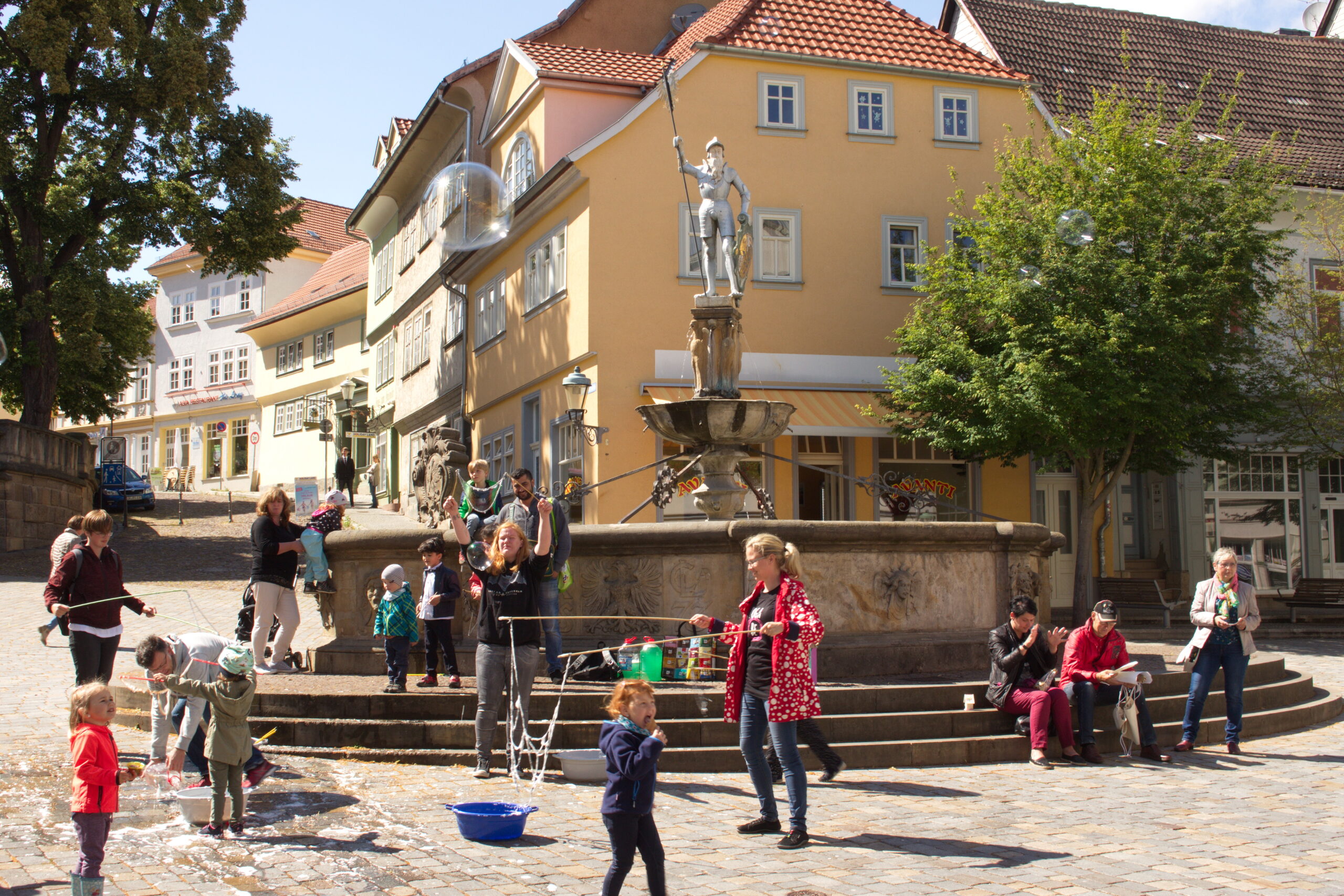 Unterhalb der Bachkirche steht der Hopfenbrunnen, um 1573 in Stil der Spätrenaissance erbaut. Auf dem Brunnen krönt ein Ritter. Es wird vermutet, dass es sich hierbei um Fürst Günther, den Streitbaren, Waffenbruder von Wilhelm von Oranien in den niederländischen Befreiungskriegen, handelt. Um den Brunnen wurde der Hopfenmarkt abgehalten, der die zahlreichen Arnstädter Brauereien mit den notwendigen Rohstoffen versorgte.
